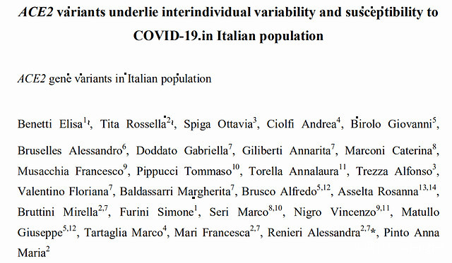 此項研究利用意大利基因組網絡(NIG),統計了意大利人ACE2基因的遺傳變異,並鑑定出3種常見的變異體和30種罕見的錯義變異體。對此,他們推測意大利人的某些特殊的ACE2變異,可能使其對SARS-CoV-2易感!