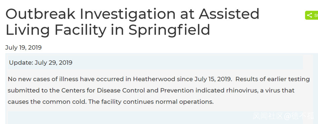 2019年7月29日,費爾法克斯縣衞生局發佈公告:自7月15日起希瑟伍德養老院沒有報告其他病例,此前疾控中心的檢測顯示有引起普通感冒的鼻病毒存在,該養老院將繼續正常運行。