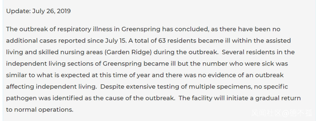 2019年7月26日,費爾法克斯縣衞生局宣告:格林斯普林養老院暴發的呼吸系統疾病已經結束,自7月15日起沒有報告其他病例。但是,儘管對多個樣本進行了廣泛的檢測,沒有發現任何特定的病原體是此次暴發的原因。