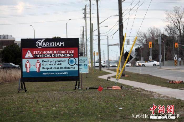 當地時間4月11日,復活節假期,加拿大大多倫多地區萬錦市公路邊豎有醒目的告示牌,提醒民眾注意保持物理距離,防止病毒傳播。中新社記者 餘瑞冬 攝