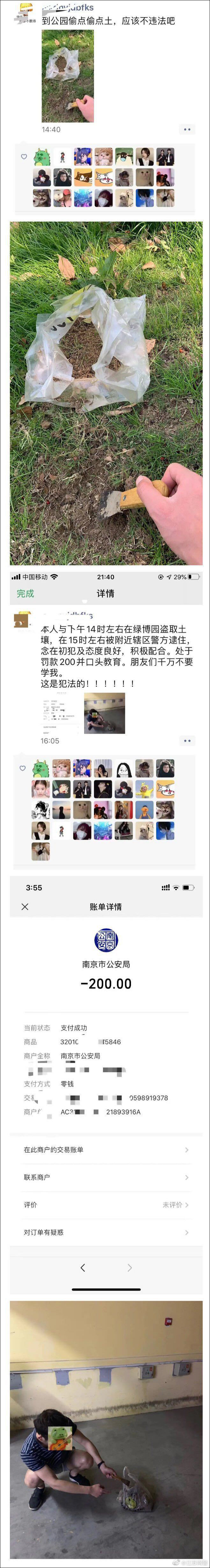 4月9日下午,微博一則帖子被瘋狂轉載,“本人於下午14時左右在綠博園盜取土壤,在15時左右被附近轄區警方逮住,念在初犯及態度良好,積極配合。被處以罰款200元並口頭教育。朋友們千萬不要學我。這是犯法的!!!!”。