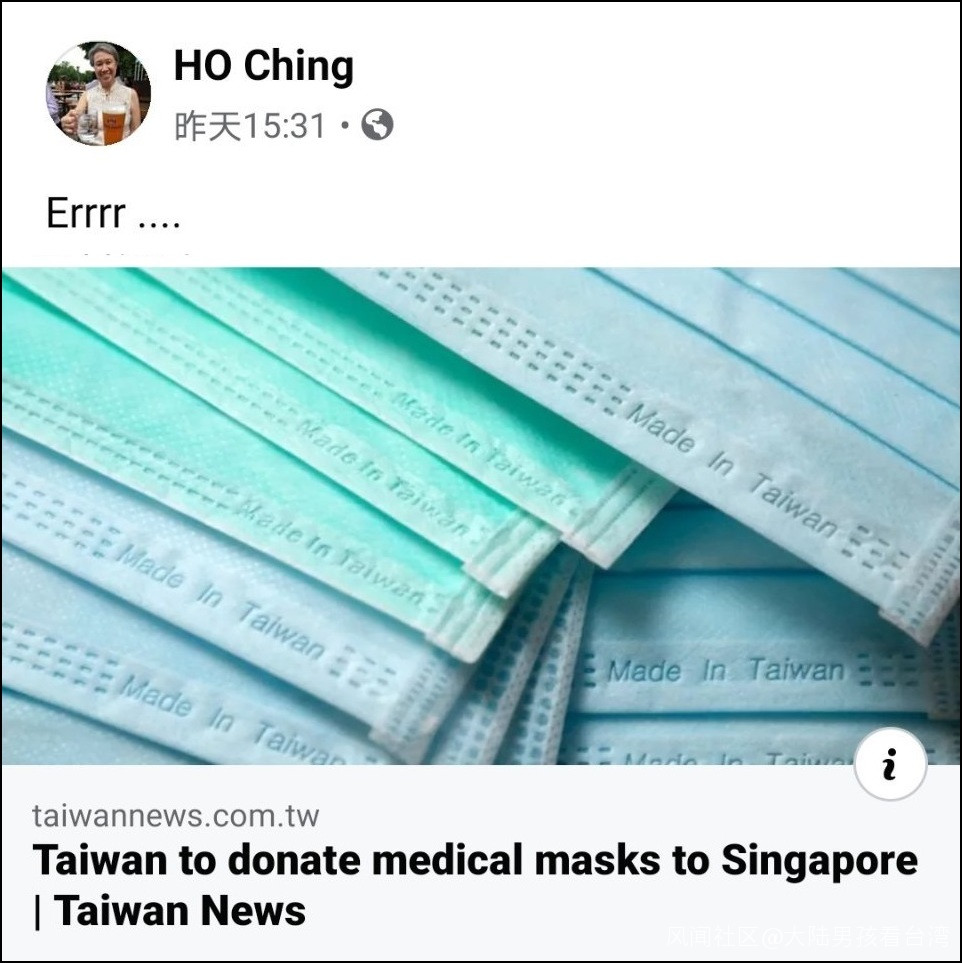 有意思的是,還有台灣網民冒充新加坡網民留言,説是新加坡口罩供應緊張,不管是哪個政府捐贈來的,讓總理夫人務必都接受下來。