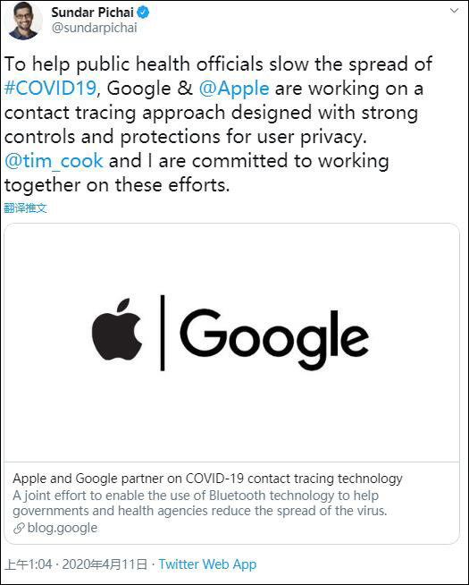 谷歌CEO皮查伊在自己推文中説,為了幫助公共衞生部門減緩新冠肺炎疫情的擴散,谷歌和蘋果正在聯手設計一款具有強大控制與隱私保護功能的接觸追蹤方法。