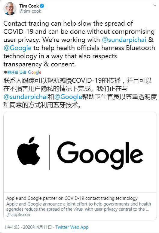 庫克在自己的推文中説,接觸追蹤為可以幫助減緩新冠肺炎的蔓延,並且同時可以在不損害用户隱私的情況下做到。為此,蘋果將與谷歌合作,利用藍牙技術聯合推出一項追蹤疫情的方案,來幫助衞生機構控制疫情。