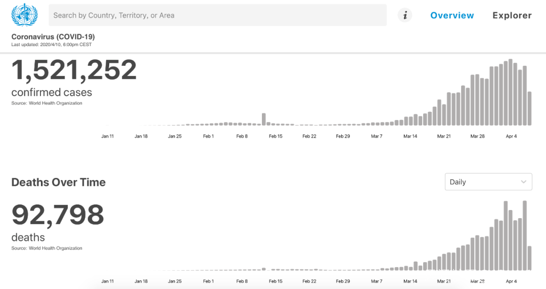 根據世衞組織最新統計數據顯示,目前全球確診新冠肺炎1521252例,死亡92798例,歐洲區域達到799696例,中國以外超過143萬例。