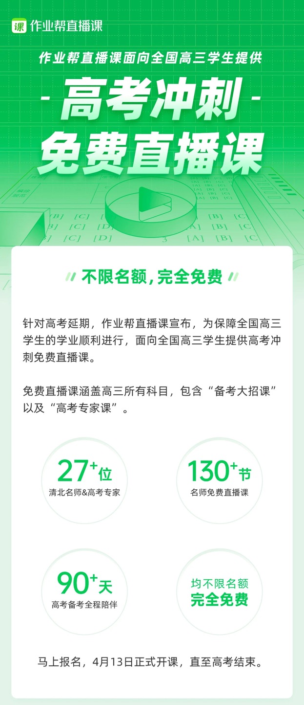 為幫助高三學子以最好的精神面貌面對高考,繼"春季加油站計劃"後,作業幫直播課再次推出的“高考衝刺免費直播課”於今日正式上線,並將持續到高考結束。