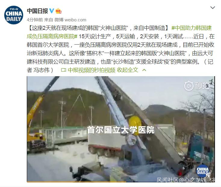 這座2天就在現場建成的韓國“火神山醫院”,來自中國製造來源:中國日報微博