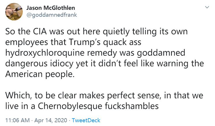 一位網友在推文寫道:“所以中情局就是悄悄地告訴自己人,特朗普推薦的那個混賬藥很危險,卻不告訴美國老百姓?”