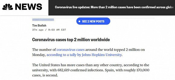 圖片來源:Twitter 4月14日早上,全球多家媒體引用美國約翰斯·霍普金斯大學的統計,報道全球累計新冠確診病例突破200萬,美國一日內確診激增超10萬例,達682619例。