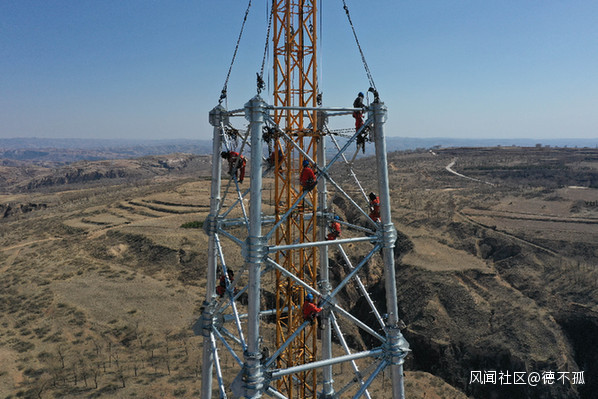 國網工人在蒙西—晉中特高壓交流工程線路工程(內蒙古段)12號鐵塔施工現場作業(無人機照片)。該工程是華北“兩橫三縱”特高壓交流主網架的重要組成部分。記者 徐欽 攝