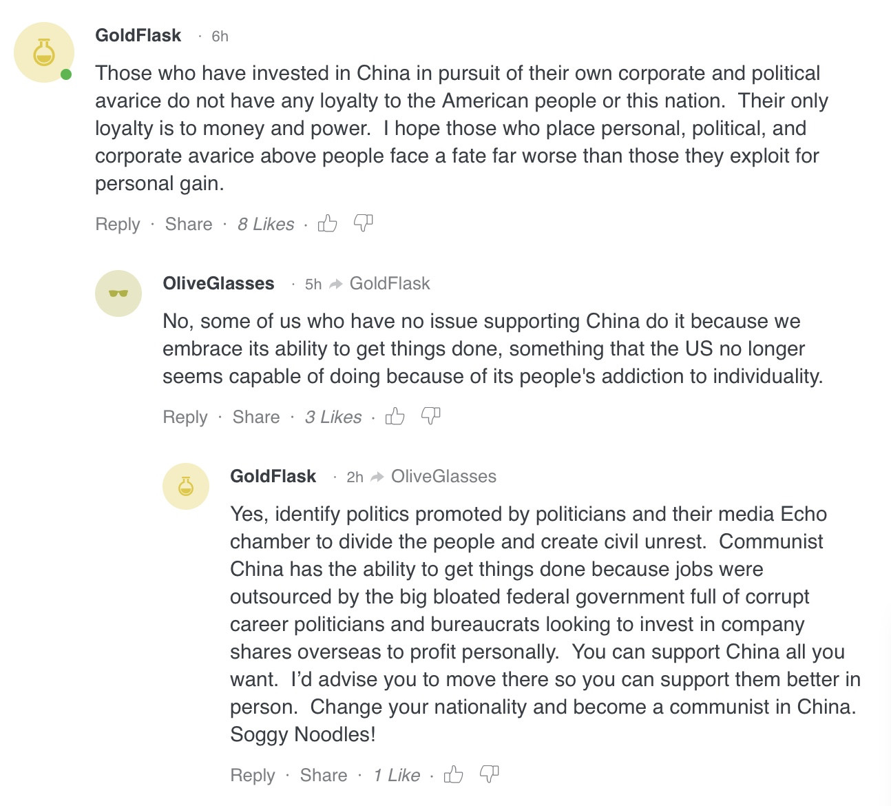 C:那些為了追求自己的企業和政治利益而在中國投資的人對美國人民和這個國家沒有任何忠誠。他們唯一的忠誠是金錢和權力。我希望那些把個人、政治和企業利益凌駕於國民之上的人,將來的命運遠比那些個人利益被剝削的人更糟糕。