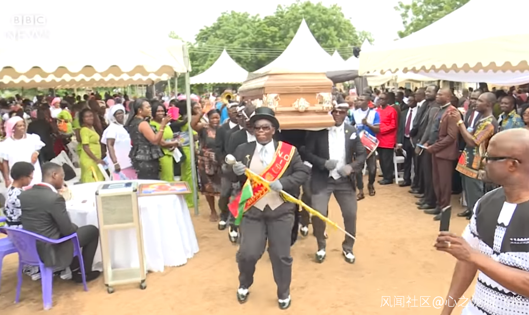 其實,“加納抬棺小哥”的視頻並非近期才有,它是來自於BBC非洲頻道2017年對於加納加納共和國當地葬禮上一種抬棺舞的報道,人們會僱傭專業的抬棺隊用這種形式送別親人。