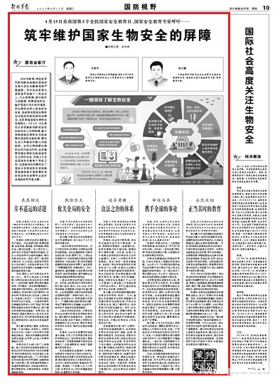 温元麟:今年全民國家安全教育日的活動主題為“堅持總體國家安全觀,統籌傳統安全和非傳統安全,為決勝全面建成小康社會提供堅強保障”。目前,新冠肺炎疫情是全球關注的焦點,開展生物安全教育正當其時。生物安全教育是全社會的事,我們應當調動一切積極因素,積極鼓勵全社會參與生物安全宣傳教育,形成全黨、全軍、全社會共同參與的良好局面。應把加強全民生物安全宣傳教育納入貫徹落實防範重大風險的工作部署之中,納入各級領導幹部的議事日程。