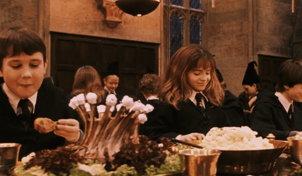 自動續盤都只是小case,霍格沃茨在三強爭霸賽舞會之前的晚宴上還有更厲害的點菜方式:金光閃亮的盤子裏還沒有食物,但每個人面前都擺着一份小菜單,沒有侍者只要對着盤子,清晰地説出你想要點的菜,盤子裏就會出現夢想中的食物。