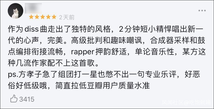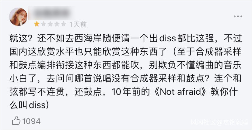 也有打1星的人嘲諷了這首歌的質量,他評論説:西海岸隨便請一個出diss都比這強,不過國內欣賞水平也只能欣賞這種東西了。