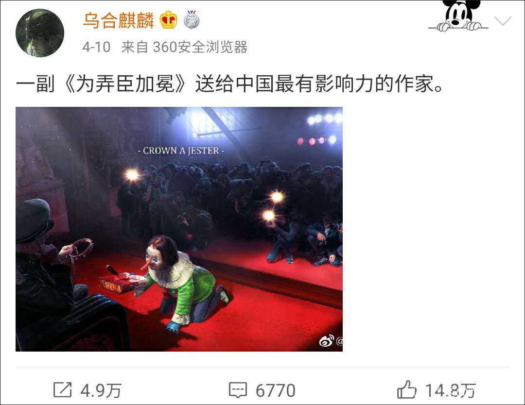 前幾天,一位名叫烏合麒麟的畫手,創作了一幅名叫《為弄臣加冕》的作品。畫手本人發表這份作品時,只是説獻給中國最有影響力的作家。