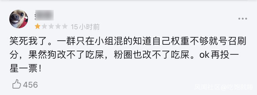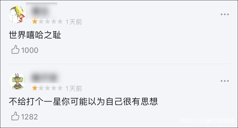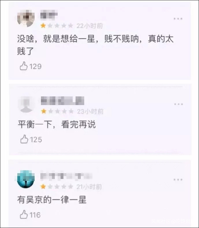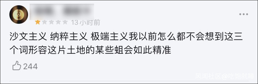 説多了都是淚。其實這種打1星的操作,大家早就見怪不怪了。這位網友就説,一切是他熟悉的味道,從《戰狼》《我和我的祖國》到金雞獎等,我們看到這羣人打1星的行為還少嗎,這背後少不了一羣“恨國黨”的身影。