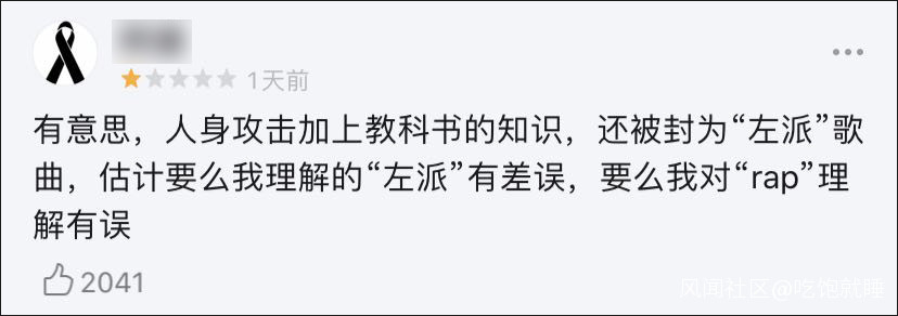 一個被點了2000多個讚的1星評論是這麼説的:有意思,人身攻擊加上教科書的知識,還被封為“左派”歌曲,估計要麼我理解的“左派”有差誤,要麼我對“rap”理解有誤。