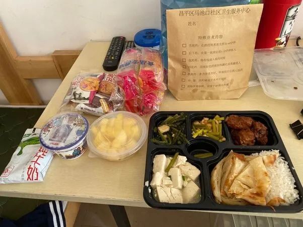 這是社區志願者分發的食品,你可以看到米飯、牛奶、酸奶、水果、一些零食和一袋中藥茶。他們説茶能增強你的免疫力。