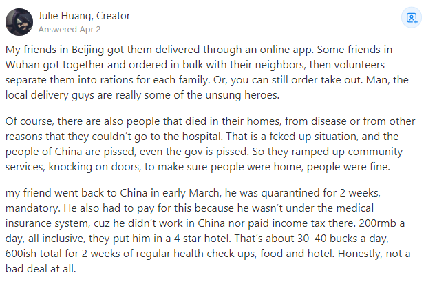 我的朋友三月初回到中國,他被強制隔離了兩週。他還必須為此支付費用,因為他沒有在中國工作,所以他沒有中國的醫保,也沒有在中國繳納所得税。200元一天,他們把他安排在一家四星級酒店。每天大約30-40美元,總共600美元,用於兩週的定期健康檢查、食品和酒店費用。老實説,一點也不壞。