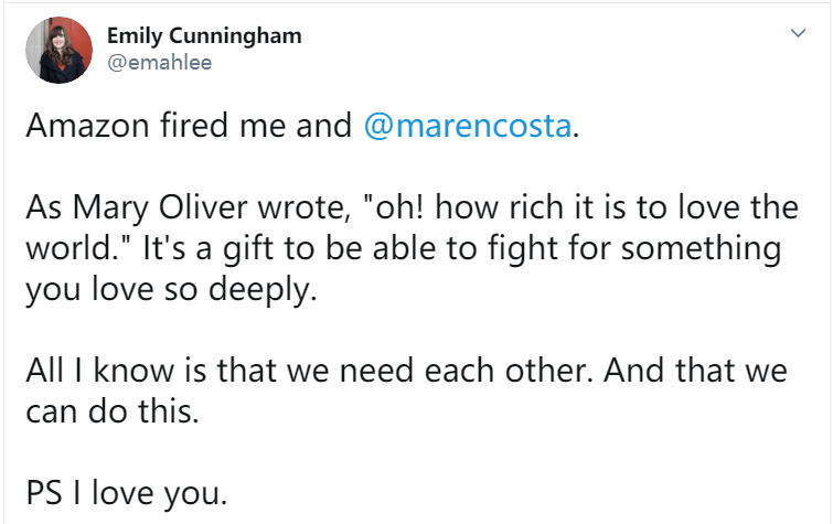 亞馬遜公司發言人表示,辭退二人並不是“報復”,而是因為二人多次違反了“對外發聲和保持社交距離的相關規定。”
