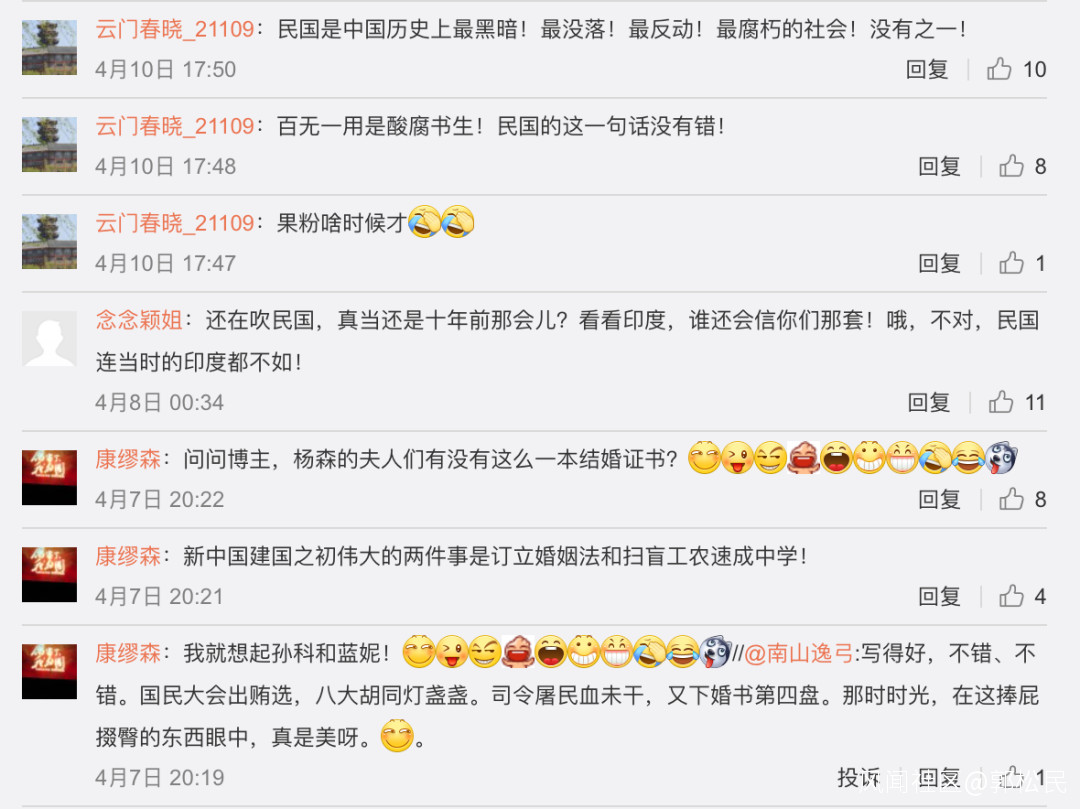 呵呵,又一個來捧民國臭腳的,那時候滿大街妓院有錢人娶小老婆,窮人家賣女兒,你們這些人不光眼瞎心也瞎,歷史也沒學,語文不及格拿着隻言片語就腦補那個吃人的舊時代的美好。