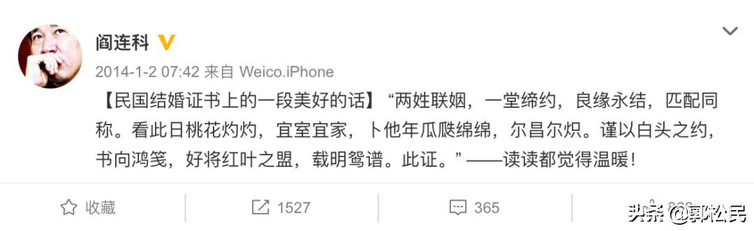 【民國結婚證書上的一段美好的話】“兩姓聯姻,一堂締約,良緣永結,匹配同稱。看此日桃花灼灼,宜室宜家,卜他年瓜瓞綿綿,爾昌爾熾。謹以白頭之約,書向鴻箋,好將紅葉之盟,載明鴛譜。此證。” ——讀讀都覺得温暖!