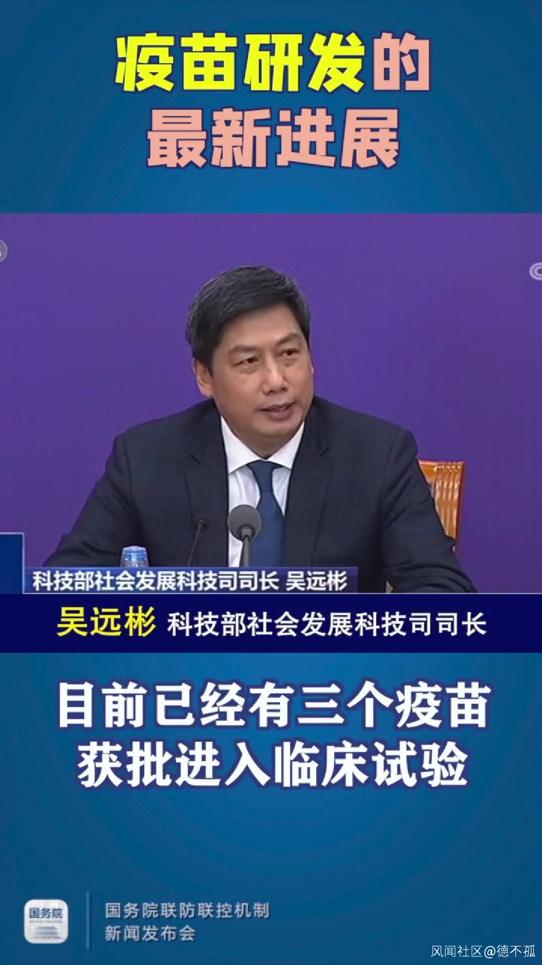 國務院聯防聯控機制新聞發佈會公佈疫苗研發最新進展,視頻截圖