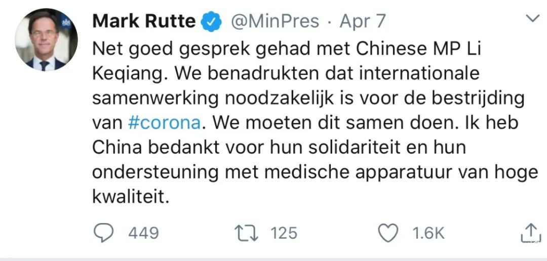 在物資採購上,荷蘭迅速成立了應急採購中心。荷蘭首相與李克強總理通電話, 之後又發微博讚揚中國的高質量醫療物質。