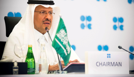 沙特阿拉伯能源部長阿卜杜勒阿齊茲·本·薩勒曼·阿勒沙特王子在利雅得召開的歐佩克和非歐佩克國家緊急會議上通過視頻連線發表講話。