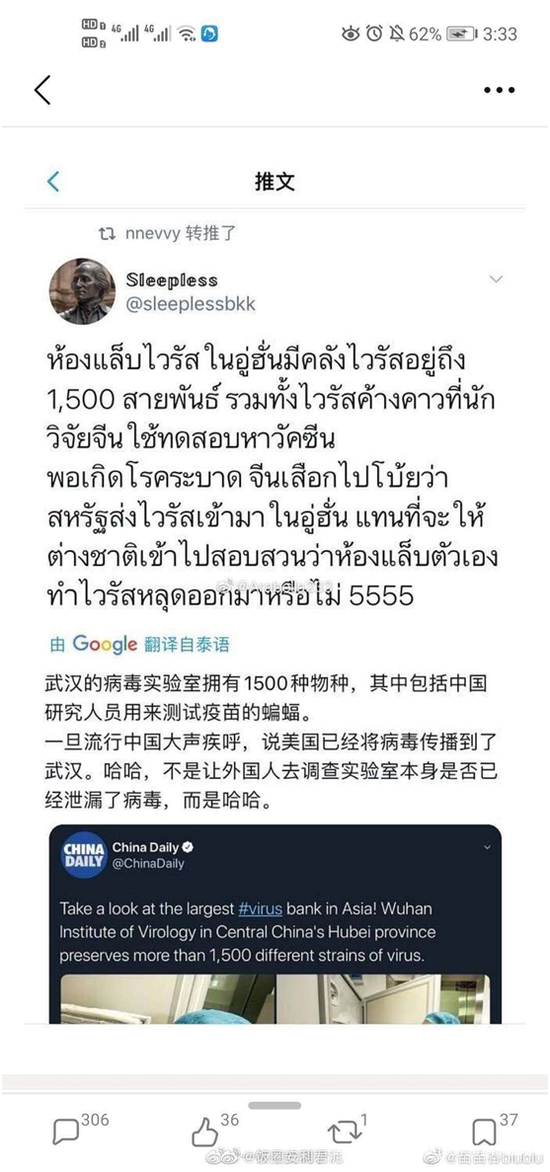 而在男友為“港獨”帖道歉並刪帖之後幾分鐘,New又轉發了一則謠言貼稱,“武漢病毒實驗室擁有1500種物種,包括中國研究人員用來測試疫苗的蝙蝠。當疫情爆發後,中國非但沒有讓外國對自己的實驗室是否存在病毒泄露進行調查,反而大聲怪罪美國將病毒帶到了武漢。”