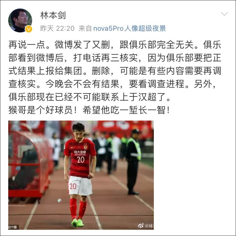 22:20,林本劍稱微博發了又刪和俱樂部無關,“俱樂部看到微博後,打電話再三核實,因為俱樂部要把正式結果上報給集團。刪除,可能是有些內容需要再調查核實。今晚會不會有結果,要看調查進程。另外,俱樂部現在已經不可能聯繫上于漢超了。猴哥是個好球員!希望他吃一塹長一智!”