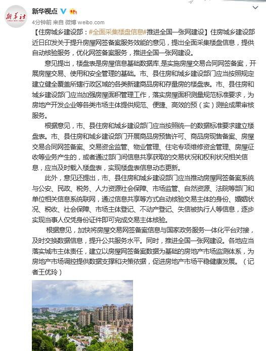 住房城鄉建設部:全面採集樓盤信息 推進全國一張網建設來源:新華視點
