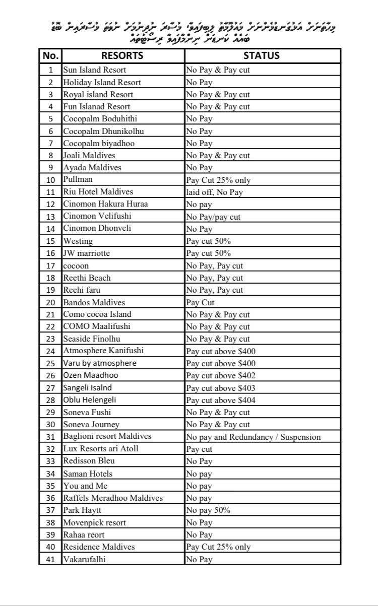 在馬爾代夫旅遊業工會(Tourism Employees Association of Maldives)發佈的一份調查中,記者發現,截止到3月30日,已有79家度假酒店出現了降薪的情況,並且其中有50%以上的酒店停止支付員工薪水。