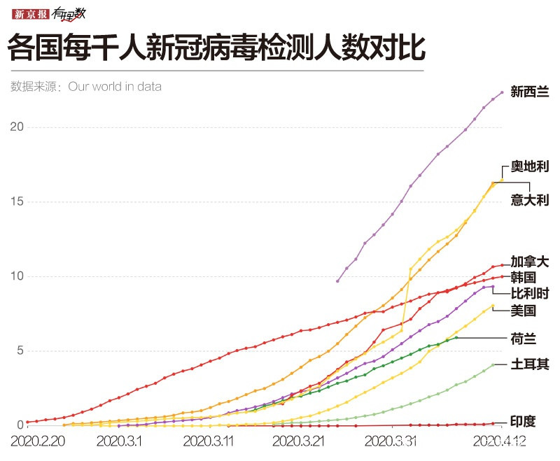 從每千人檢測的數量比例看,土耳其不僅低於感染人數較高的意大利,也低於總確診人數低於土耳其的新西蘭、荷蘭、比利時等國家。