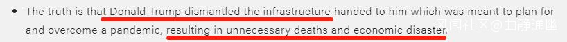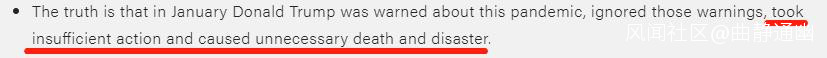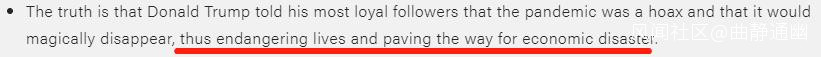 由於對這場危機應對無能,原本強勁的經濟在交給特朗普後 ,變成了一場災難 ,給無數美國人帶來痛苦,並危及美國人的生命 。
