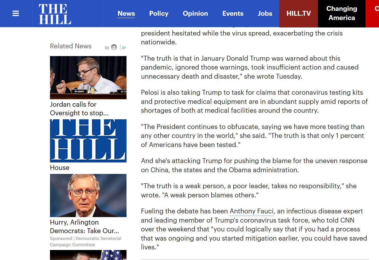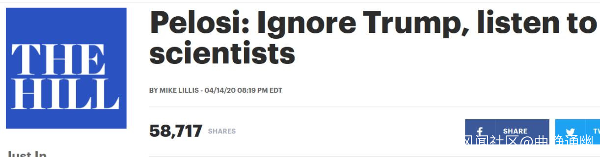 △美國《國會山報》報道佩洛西發表的相關文章:請忽略特朗普,多聽聽科學家的意見