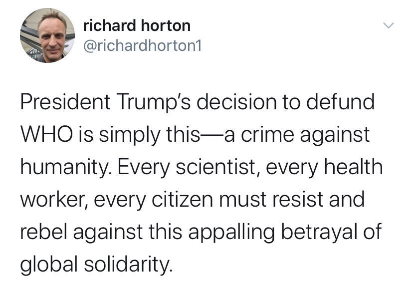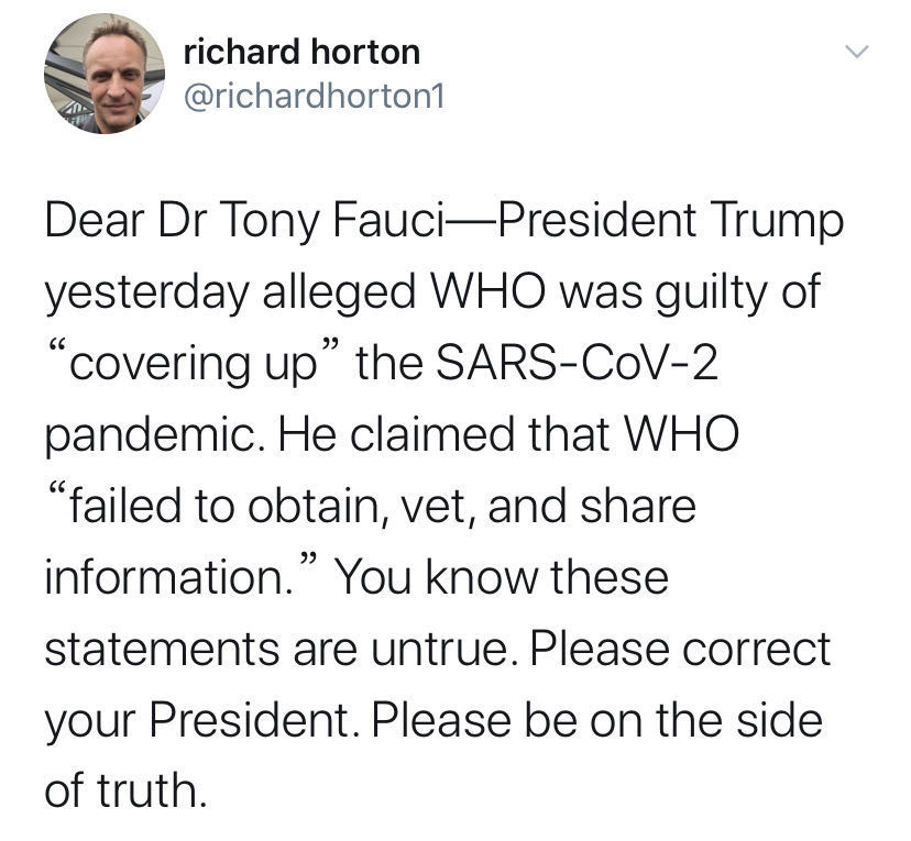 之後理查德·霍頓進一步向美國傳染病專家安東尼·福奇喊話稱:“特朗普總統昨天指控有人‘掩蓋’了新冠病毒大流行,他宣稱世衞組織‘未能及時分享疫情信息’,你知道這些説法是不真實的,請糾正你們的總統,我們站在真理的一邊。”