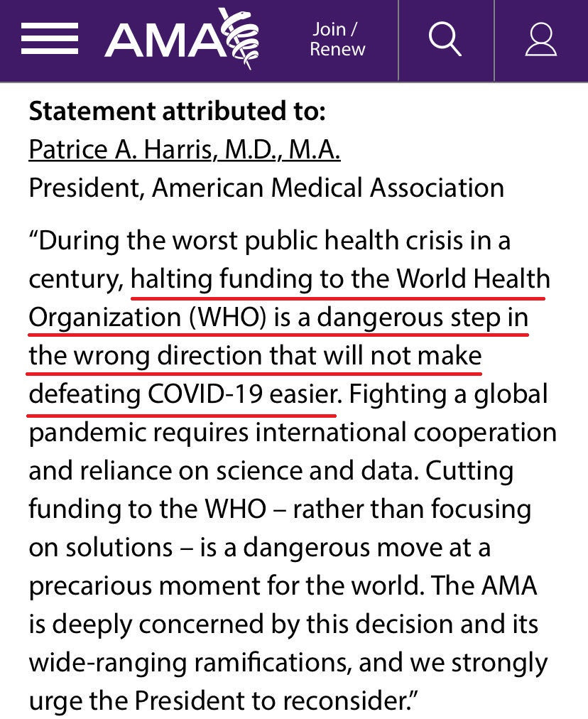 美國醫學協會主席帕特里夏·哈里斯(Patrice Harris)在聲明中説:“美國正處在一個世紀以來最嚴重的公共衞生危機當中,暫停向世界衞生組織提供資金是朝着錯誤方向邁出的危險一步,這不會讓擊敗新冠病毒更加容易。”哈里斯強調説,抗擊全球流行病需要國際合作。美國醫學協會對這一決定及其廣泛的影響深表關切,我們強烈建議總統重新考慮。”