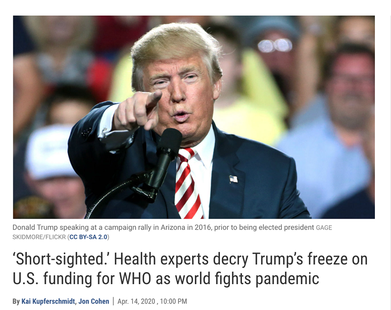 當地時間14日的白宮記者會上,特朗普宣佈美國將暫停資助世界衞生組織,他指責世界衞生組織沒有及時分享疫情信息,沒有及時提供防疫政策建議,沒有及時宣佈“全球大流行”等,號稱要讓該組織“為如此多的死亡負責”。