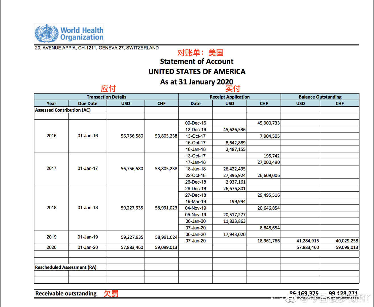 同時,根據今日俄羅斯(RT)近期公佈的數據顯示,在宣佈暫停資助WHO前,美國還有着鉅額欠款。 美國拖欠2019年世衞組織會費的比例仍然超過70%,應在今年1月1日前繳納總額約1.2億美元的2020年會費,至今分文未付。