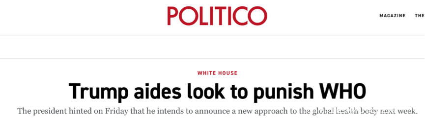 △美國“政客”網:特朗普的助手們或想懲罰世衞組織