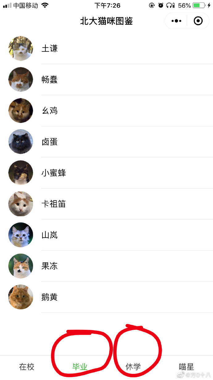 小程序還用擬人化的“休學”和“畢業”來記錄貓貓的生存狀態,“休學”表示長時間未發現蹤跡,“畢業”表明已被領養。