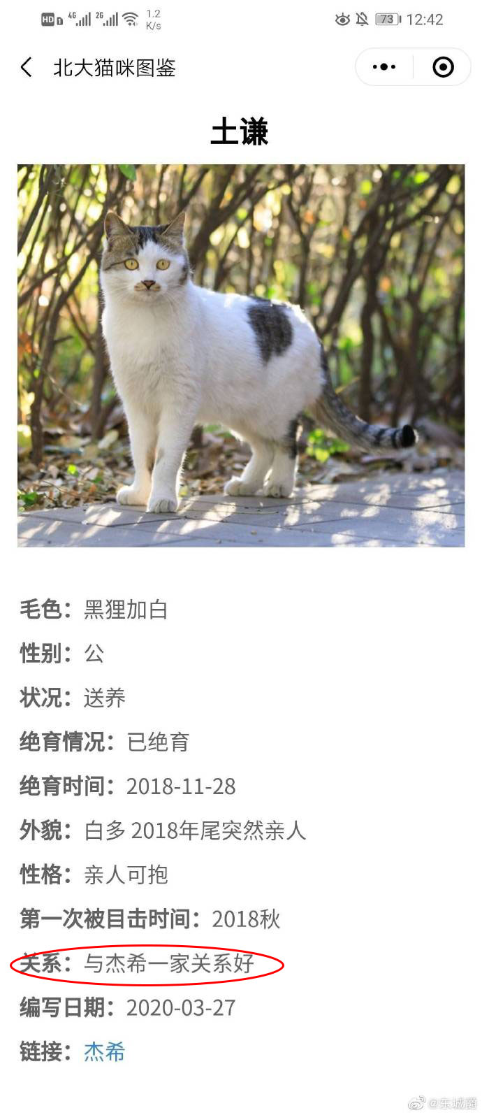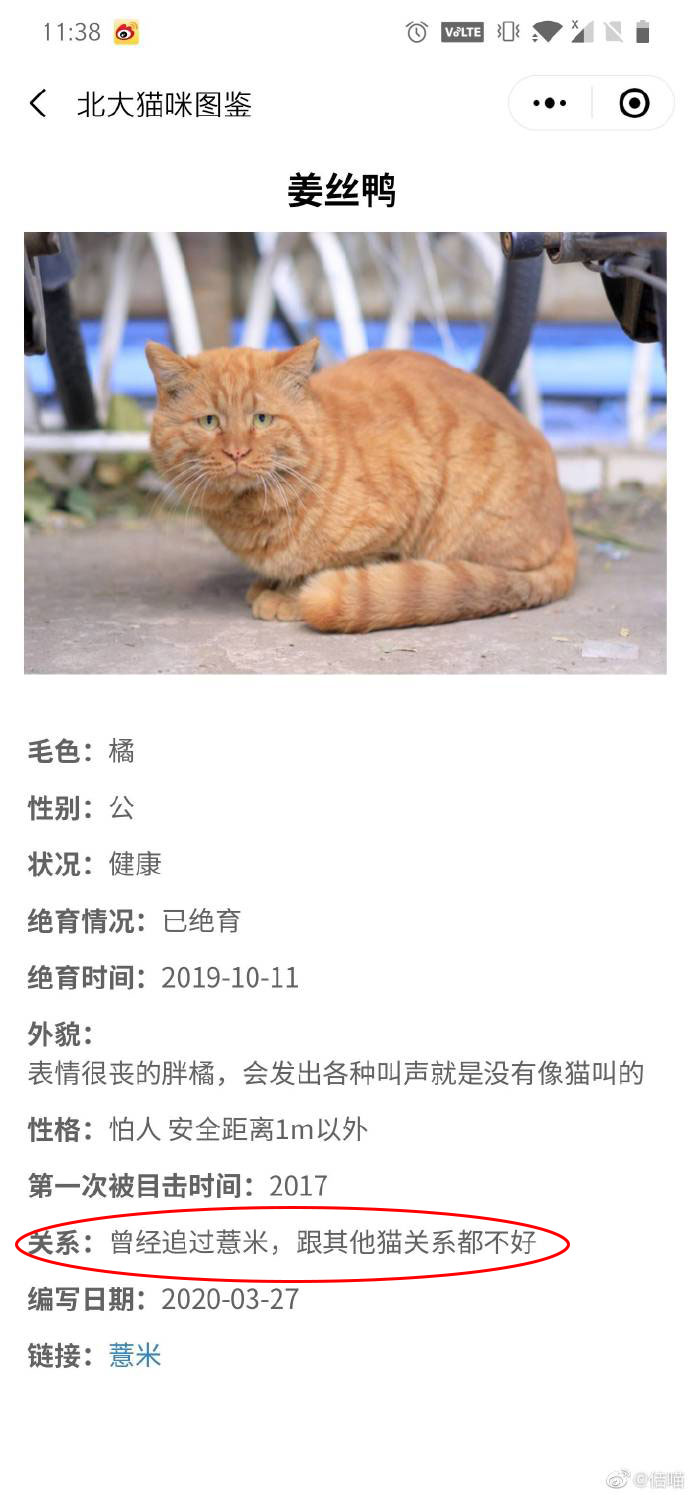 小程序中,**每隻貓都擁有自己的檔案:名稱、毛色、外貌特色、性格、絕育情況、貓圈社交關係等等一目瞭然。**比如“大臉盤子+鬥雞眼”就叫“大盤雞”,眼睛一大一小和《全職高手》王傑希“大小眼”特色相同,就叫“傑希”……
