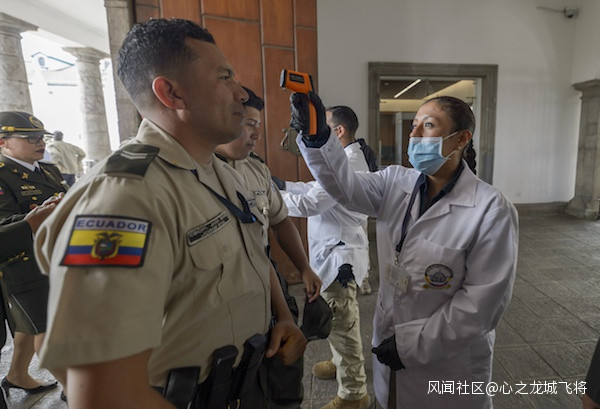2020年3月13日,在厄瓜多爾首都基多,防疫人員在給警察測體温。新華社 資料 《紐約時報》上週一則報道,提到厄瓜多爾因新冠失去家人的家庭,5天之內頻繁聯繫公共衞生網絡,都沒有人回應,屍體就停在家中無人來上門處理。停屍房已經飽和,棺材不夠用,當地的紙盒包裝箱公司一天捐贈600具紙棺材來處理屍體,這些紙箱原本用來裝海鮮和香蕉。