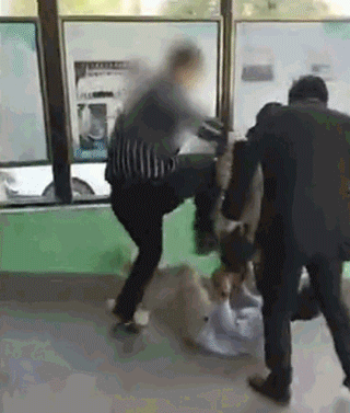 曝光的現場畫面中,只見一位穿藍色上衣的男子仰面倒在地上,一位黑衣男子用腳揣其頭部和頸部,下腳不可謂不狠。另有一位女子在旁邊大聲喊道: