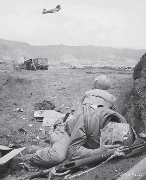 戰鬥基地的海軍陸戰隊員在CH-46型直升機接近時躲避迫擊炮火的掩護。當直升機減速並降落時,他們特別容易受到RPG的攻擊。