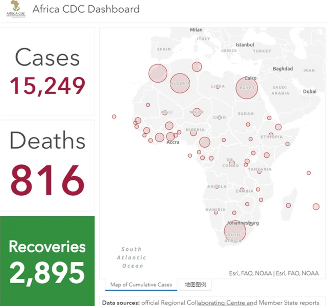 根據非洲疾控中心統計數據,截至東部非洲時間4月14日9時,非洲大陸54個國家中已有52個出現新冠肺炎疫情,累計病例數達15249例,其中死亡816例、治癒2895例。