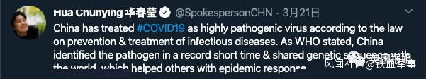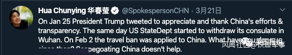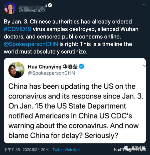 前面説到的美國發言人Morgan Ortagus,這已經不是華姐第一次懟她了。在此之前,華姐還懟了她兩次。第一次是3月19日的時候,華姐針對美國的污衊發了一條推特: