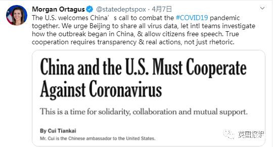 美國國務院發言人Morgan Ortagus7號在推特上轉發了這篇文章,首先是歡迎中國來美國一起討論如何戰勝這場疫情。